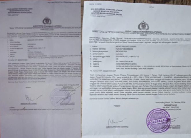 Ia pun kembali melapor dengan nomor STPL/B/38/VIII/2025/SPKT/Polsek Muara Batang Gadis/Polres Mandailing Natal/Polda Sumatera Utara.